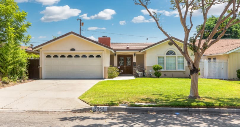 Resort style backyard has fruit trees, many greens and red flower blooming every year in January.